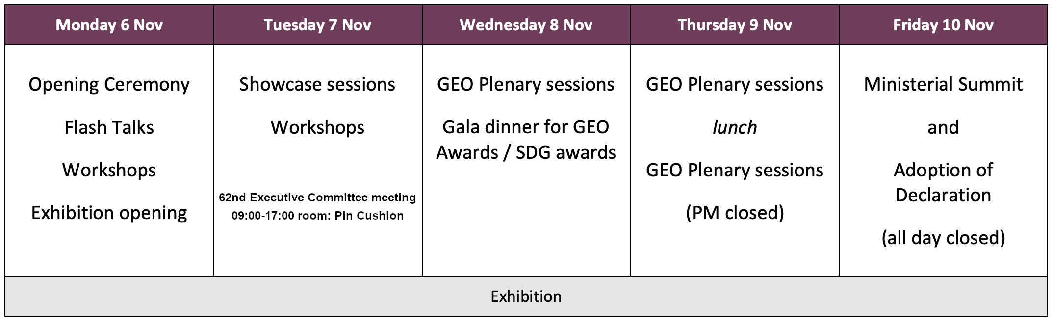 • Days 1, 2 and 3, as well as the morning of Day 4 are open to all registered attendees. The afternoon of Day 4 and the Ministerial Summit are only open to GEO Delegates and Ministers. Please note that while thematic sessions during the plenary are open to non delegates, any decisions will be made by GEO Members present.