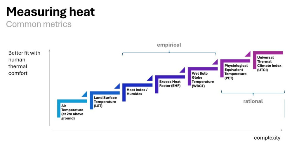 There isn’t necessarily a “one-size fits all” heat metric for all situations. Instead, the most appropriate measure often depends on the specific requirements of the application, available data, level of resources and capacity for analysis, and the target audience. Source: Martyn Clark, 2024.